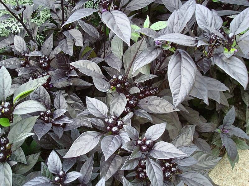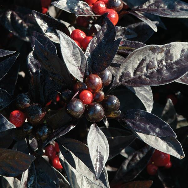 Sombre et mystérieux 🌑✨, le piment Black Pearl est un piment ornemental primé, aussi beau qu'audacieux. Ses plants compacts et touffus produisent des feuilles brillantes d'un noir de jais 🖤 et des grappes de gousses rondes et perlées. Les fruits sont d'abord noirs ⚫, puis mûrissent jusqu'à atteindre un rouge rubis profond ❤️, faisant resplendir la plante tel un joyau vivant.