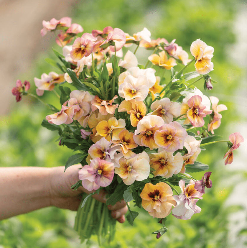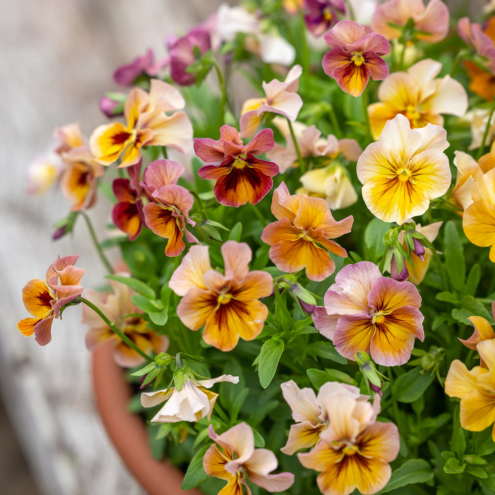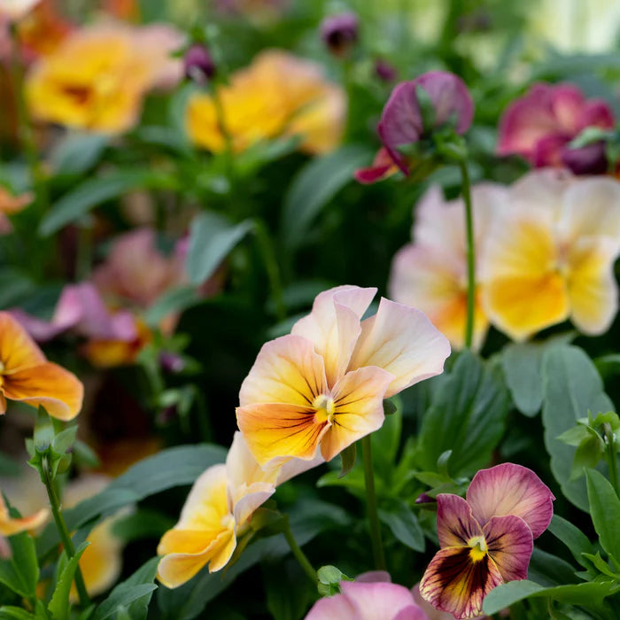 Véritable palette de peintre en fleurs 🎨🌿, la Viola Imperial Antique Shades F1 est une variété de pensée aux douces teintes abricot, rose, crème et lavande 💜🍑. Chaque fleur arbore un aspect aquarelle vintage, avec des nuances uniques qui rendent chaque fleur unique. Compactes, de saison fraîche et d'une floraison infinie, ces violas sont à la fois ornementales et comestibles ; une garniture appréciée des chefs et des pâtissiers 👨🍳🧁.
