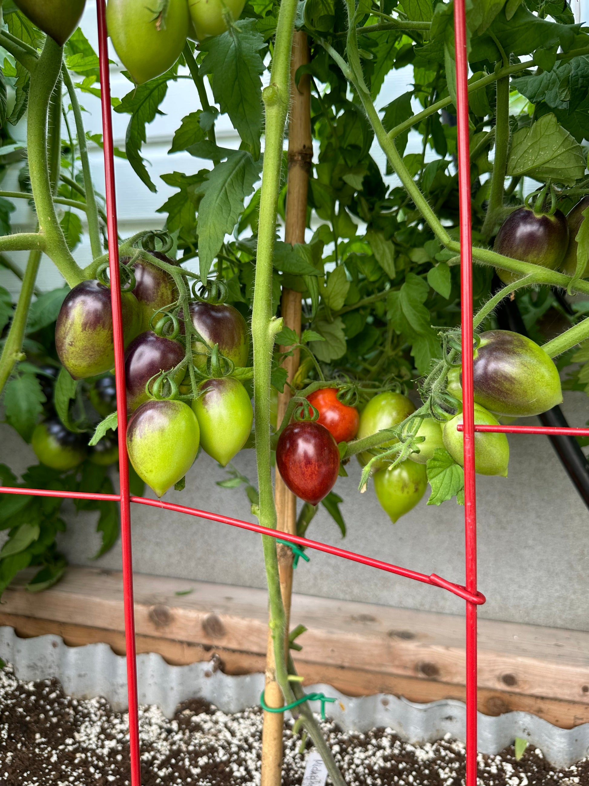 Producteur fiable et abondant, ce plant produit des grappes de fruits allongés, semblables à des prunes, mesurant en moyenne 7,5 à 10 cm de long. À maturité, leur peau rouge pourpre foncé développe une riche pigmentation anthocyanique, signe d'une saveur optimale. Récoltez régulièrement tout au long de la saison pour un approvisionnement constant de ces tomates polyvalentes.