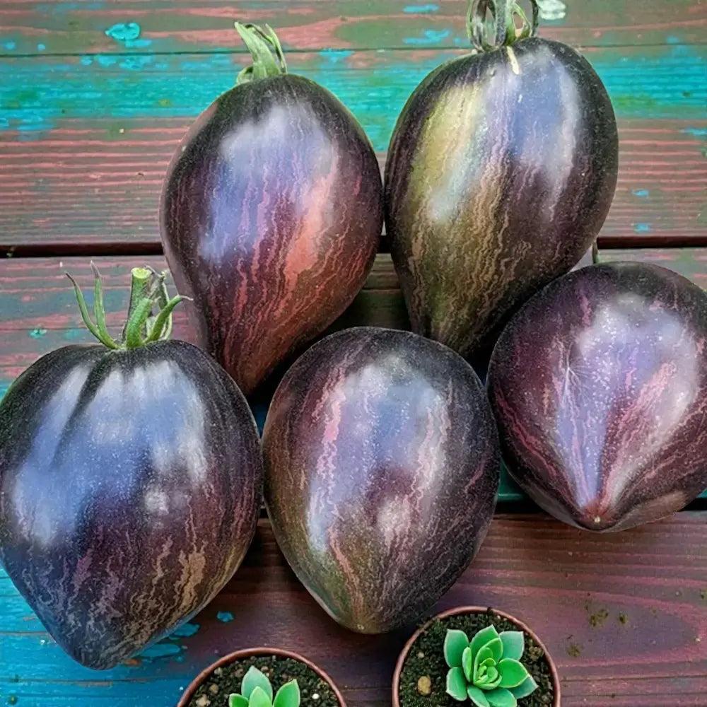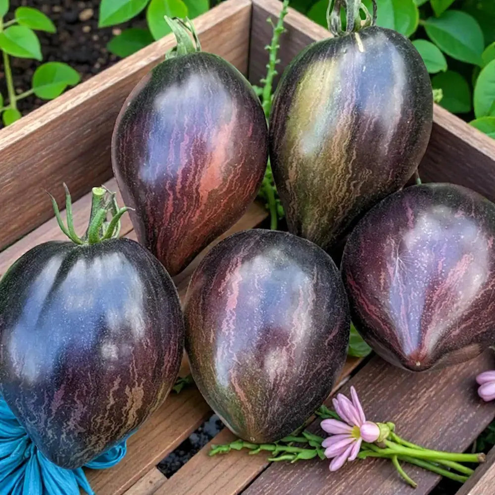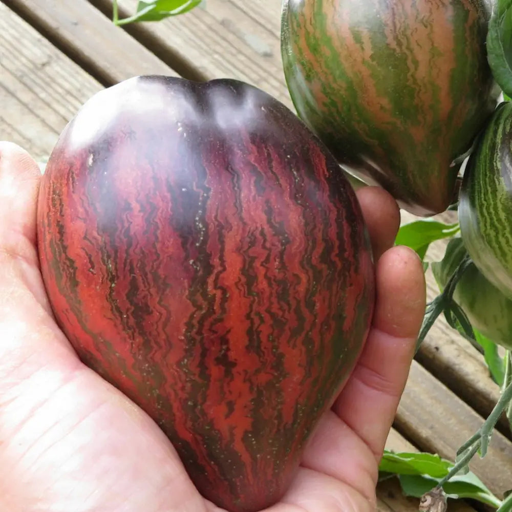 Out-of-This-World Aesthetics 🌌🍅 Created by legendary breeder Russ Crowe, the Rebel Starfighter Prime is widely considered one of the most beautiful tomatoes in existence. This variety is a cross between Xanadu Picasso and Reinhardt’s Purple Heart. It produces striking, elongated heart-shaped fruits featuring deep midnight-purple anthocyanin shoulders that bleed into vibrant maroon skins with jagged forest-green stripes.