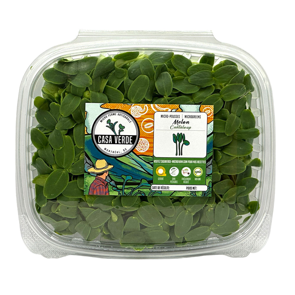 Cantaloupe melon microgreens are grown from muskmelon seed and are prized for their surprising natural sweetness and aromatic intensity. At Casa Verde Microfarm, we grow them in controlled conditions to preserve delicate leaf texture while maximizing fruity essential-oil expression.
